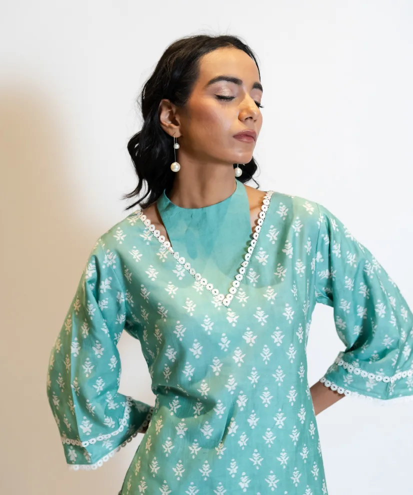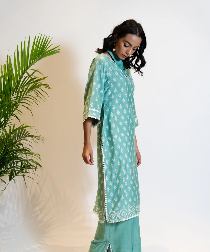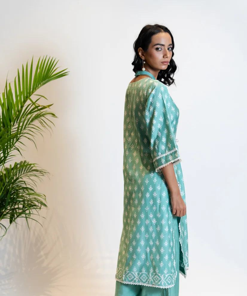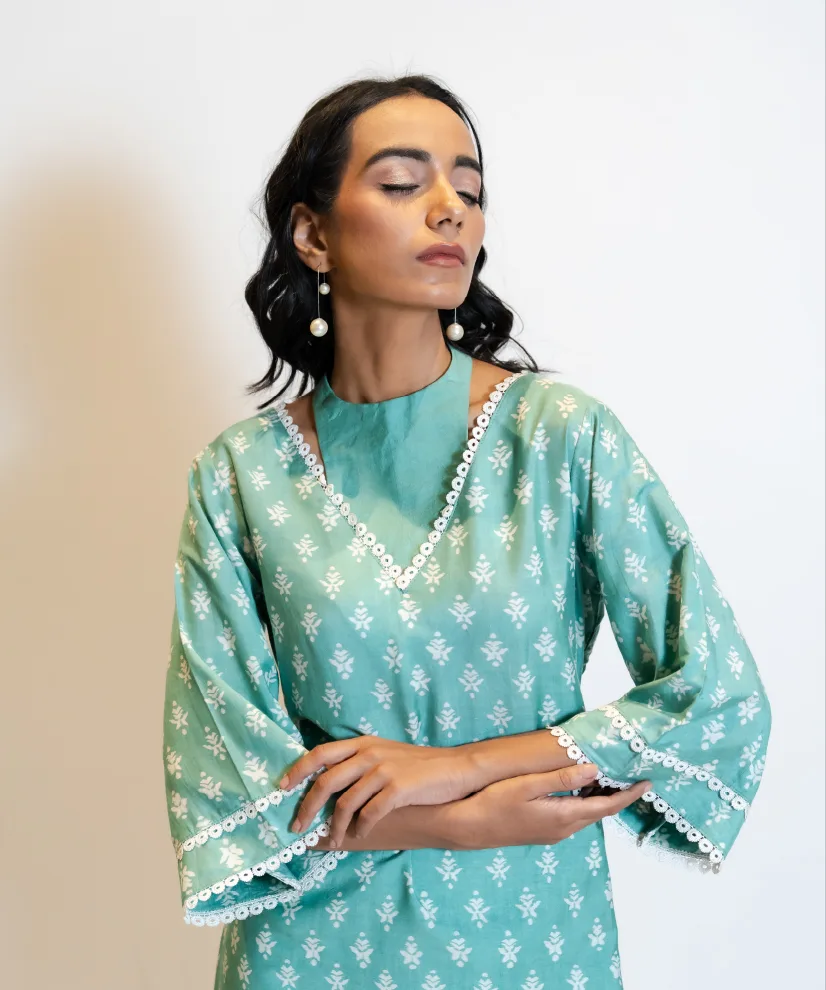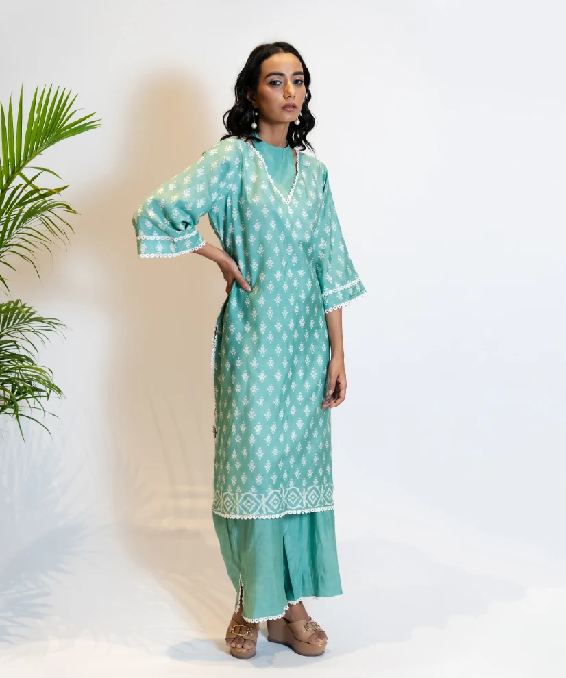 Step into summer serenity with this sky blue kurta set, crafted in featherlight airy silk that keeps you cool and graceful through the warmest days. The highlight is its scalloped V-neckline—framed in white lace that adds a polished, designer finish. Complemented by lace-trimmed sleeves and pants, the ensemble brings together comfort, elegance, and thoughtful craftsmanship in one timeless outfit.