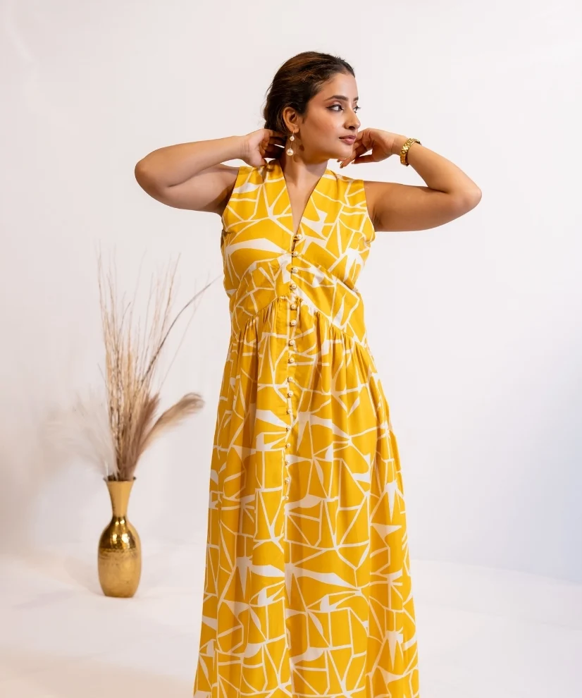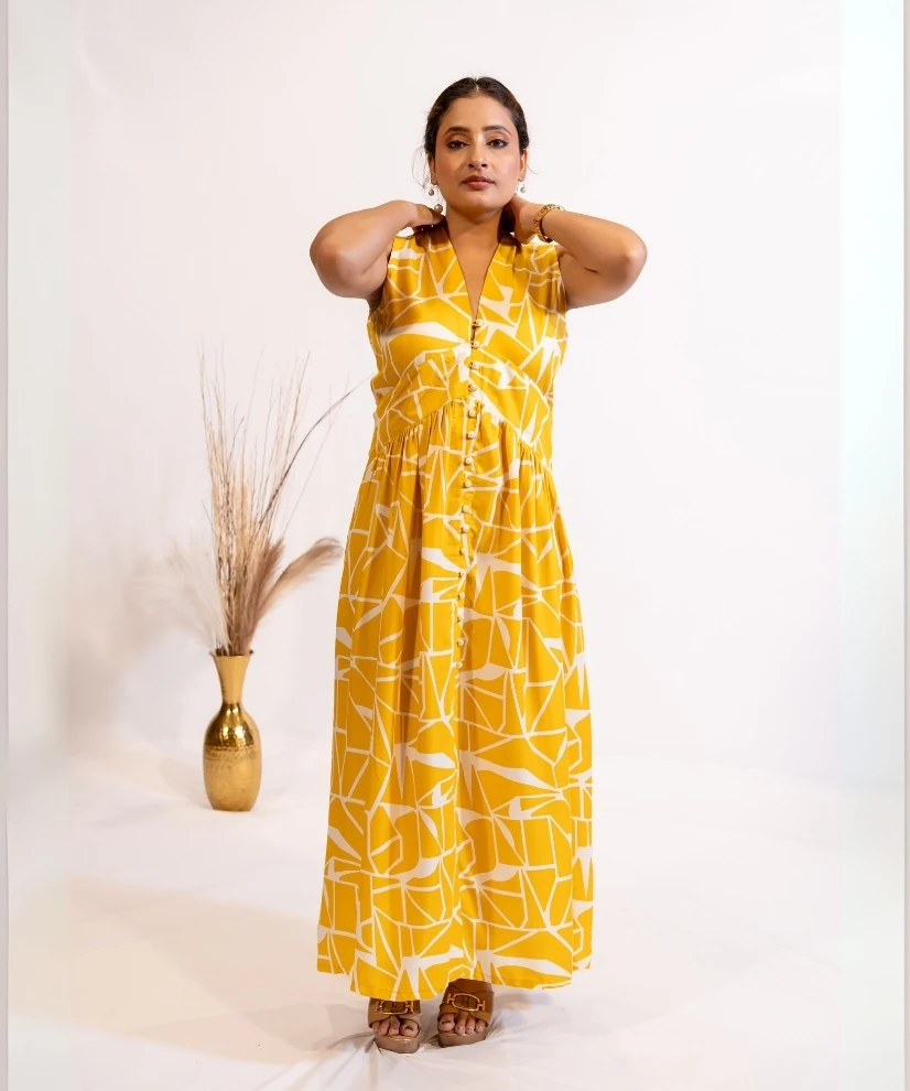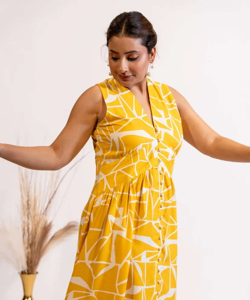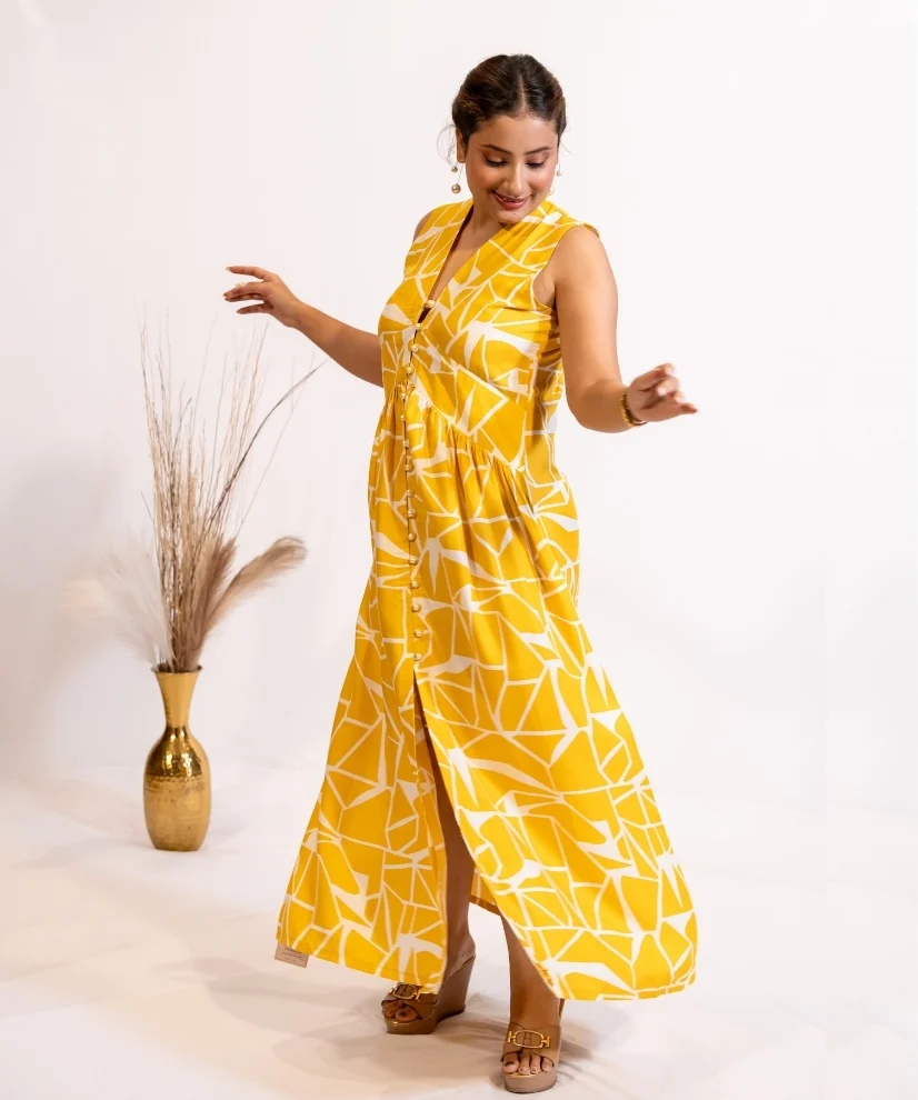 Crafted in soft, breathable cotton, this chic Sunlit Yellow dress is a vision of playful charm. The front button-down detailing, flared hemline and delicate white print on the dress – make it the perfect choice for casual outings with friends & family, beachy strolls and shopping trips !
