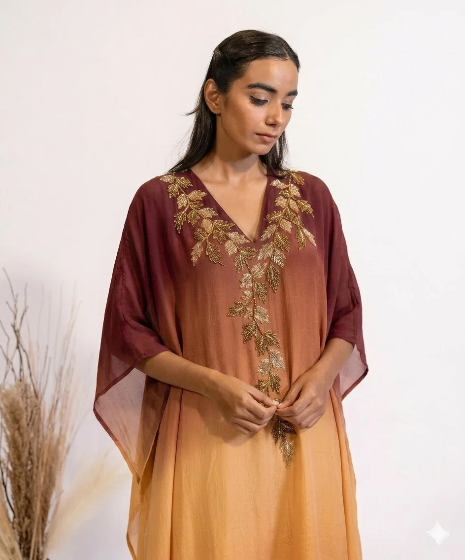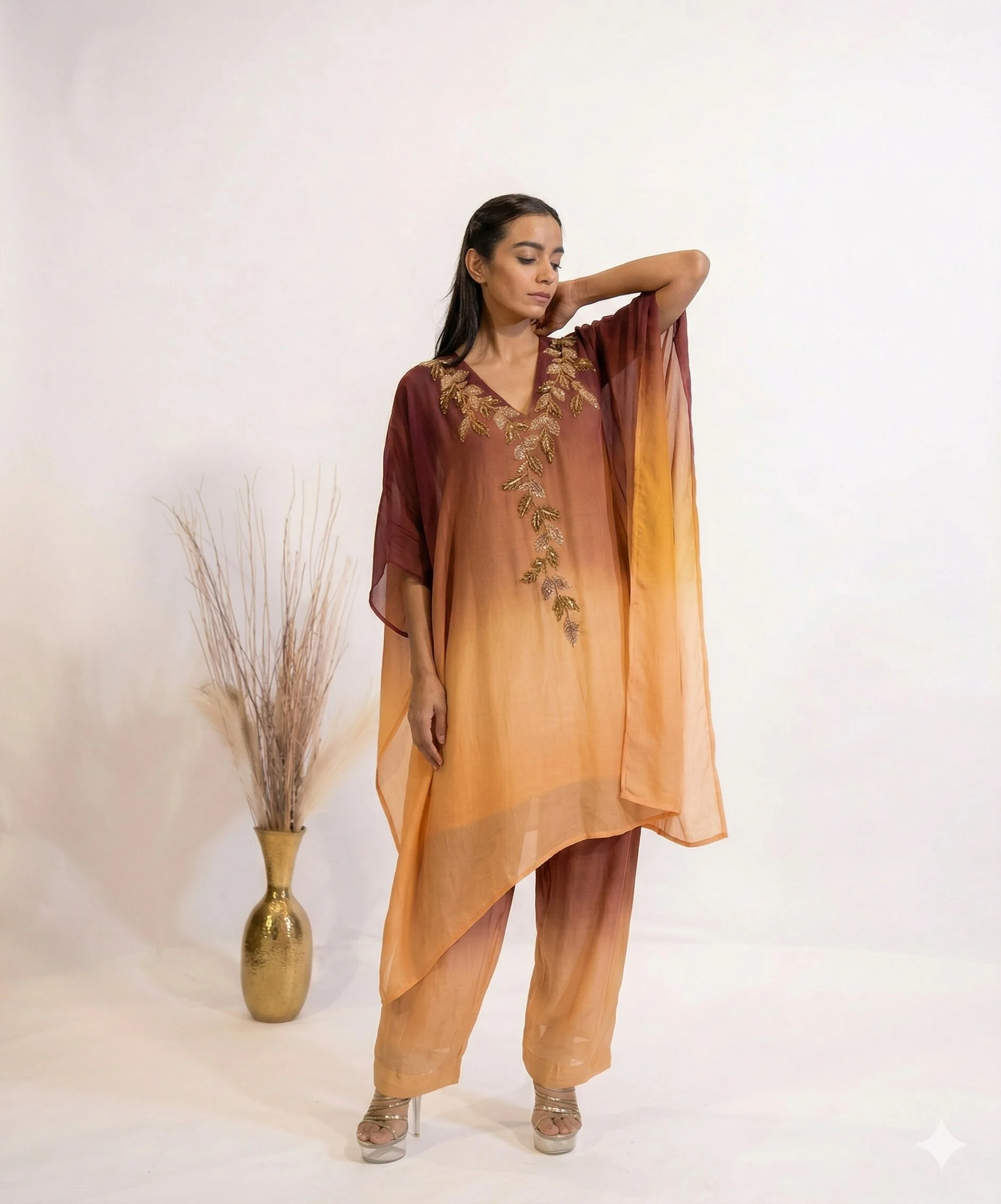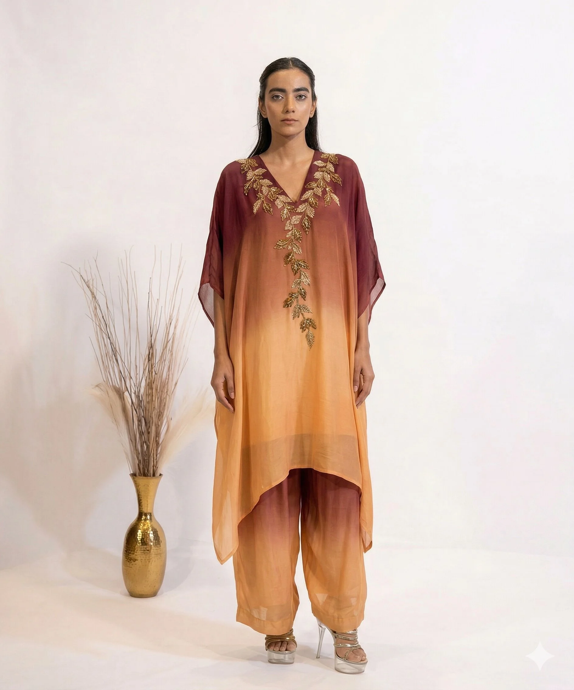 Bring a burst of Sunset Ombre Embellished Kaftan Co-ord Set with Metallic Leaf Embroidery to your wardrobe with this mustard coloured co-ord set. The rich hand embellished detailing along the neckline adds just the right amount of glamour to the outfit, making you the Show Stopper at any party ! With its flowy cut and soft drape the outfit is a perfect pick for festive evenings, family gatherings or chic day events