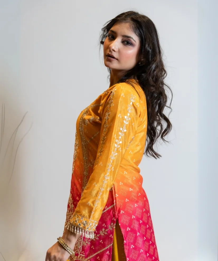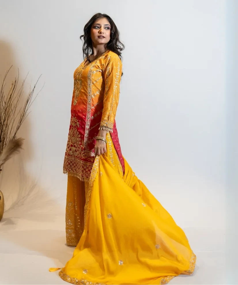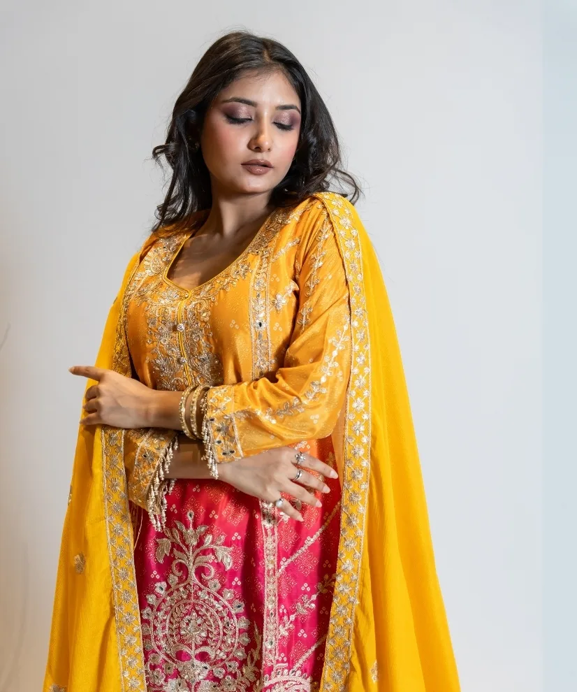 Fabric: Chinon | Weave: Embroidery| Color: Yellow Kurti & Dupatta with Multicolour Gharara | 3 Piece Set with Kurta, Lower & Dupatta included