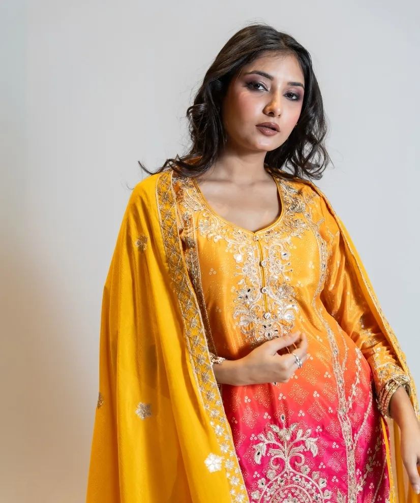 Drape yourself in festive radiance with this stunning yellow Chinon kurta set, featuring intricate embroidery and a vibrant multicolored skirt that steals the show. The embroidery on the kurta adds elegance, while the lively hues of the lower make it a perfect pick for Haldi ceremonies or joyous celebrations. Paired with a flowing dupatta, this 3-piece set exudes charm and tradition in the most vibrant way.