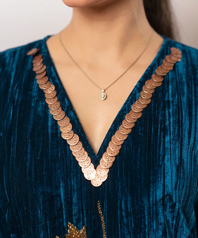 Crafted in plush teal velvet, this kaftan dress features exquisite handcrafted Aari Zardosi embroidery along the neckline and centre. The fluid silhouette and rich texture make it a striking choice for evening wear and statement occasions.