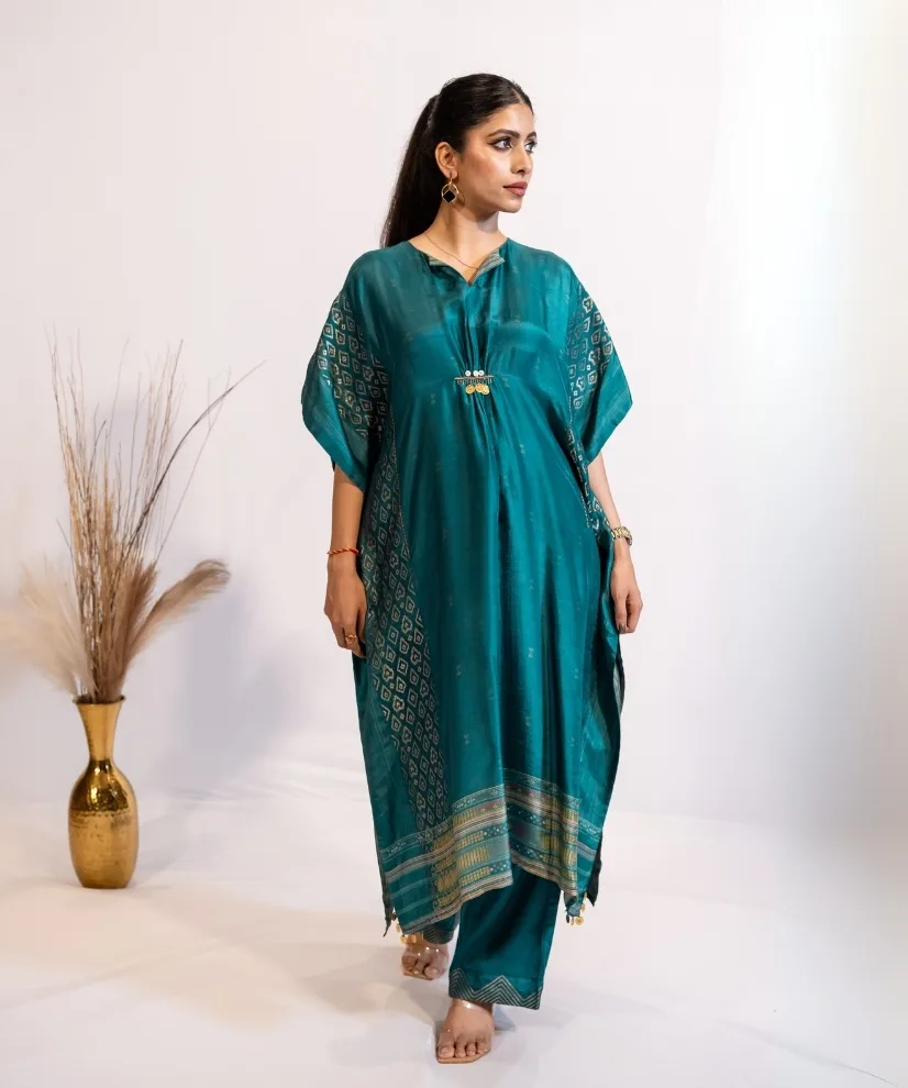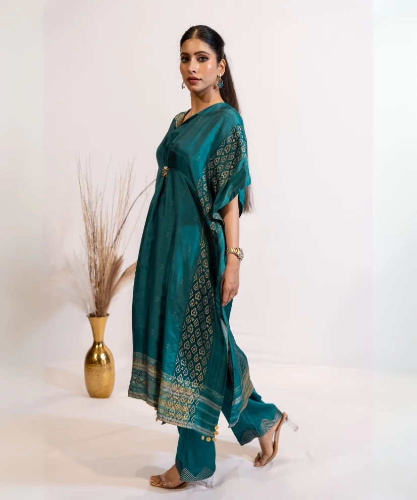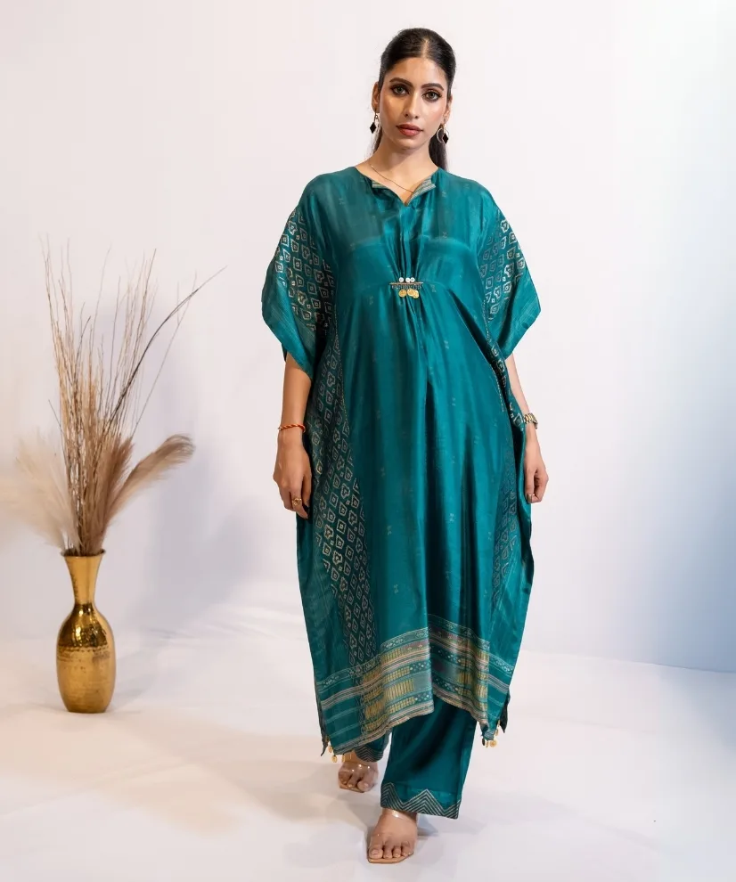 Fabric: Cotton Silk | 2 piece set with Kaftan Style Kurta & Pants | Color: Teal Blue