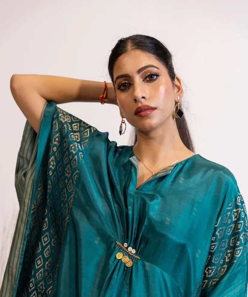 Grace meets comfort in this 2-piece teal blue cotton silk kaftan kurta set. The soft sheen of the fabric it’s flowy silhouette make it the perfect blend of regal charm and comfort. The subtle golden accents and hand embellishments at the waist add a touch of glamour to the outfit making it the perfect choice for any festive occassion