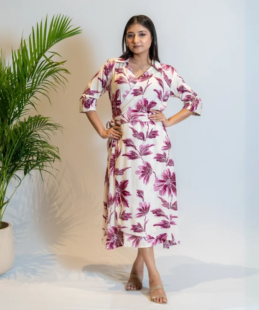 Breezy with a touch of drama, this 1-piece cotton-linen dress features an Angarkha-style wrap silhouette with a subtle nod to Japanese kimono lines. The eggshell white base is brought to life with bold plum-wine floral prints, while the belted waist gives it a flattering, feminine fit. Perfect for sunny days, casual brunches, or relaxed festive gatherings.